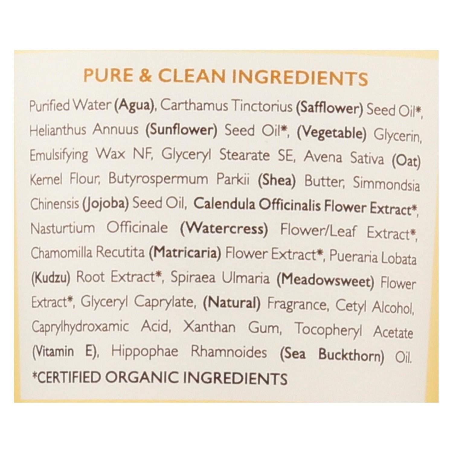 ingredients : purified water;agua;carthamus tinctorius;safflower;seed oil;helianthus annuus;sunflower;vegetable;glycerin;emulsifying wax nf;glyceryl stearate se;avena sativa;oat;kernel flour;butyrospermum parkii;shea;butter;simmondsia chinensis;jojoba;calendula officinalis flower extract;nasturtium officinale;watercress;flower/leaf extract;chamomilla recutita;matricaria;flower extract;pueraria lobata;kudzu;root extract;spiraea ulmaria;meadowsweet;glyceryl caprylate;natural;fragrance;cetyl alcohol;caprylhydrox