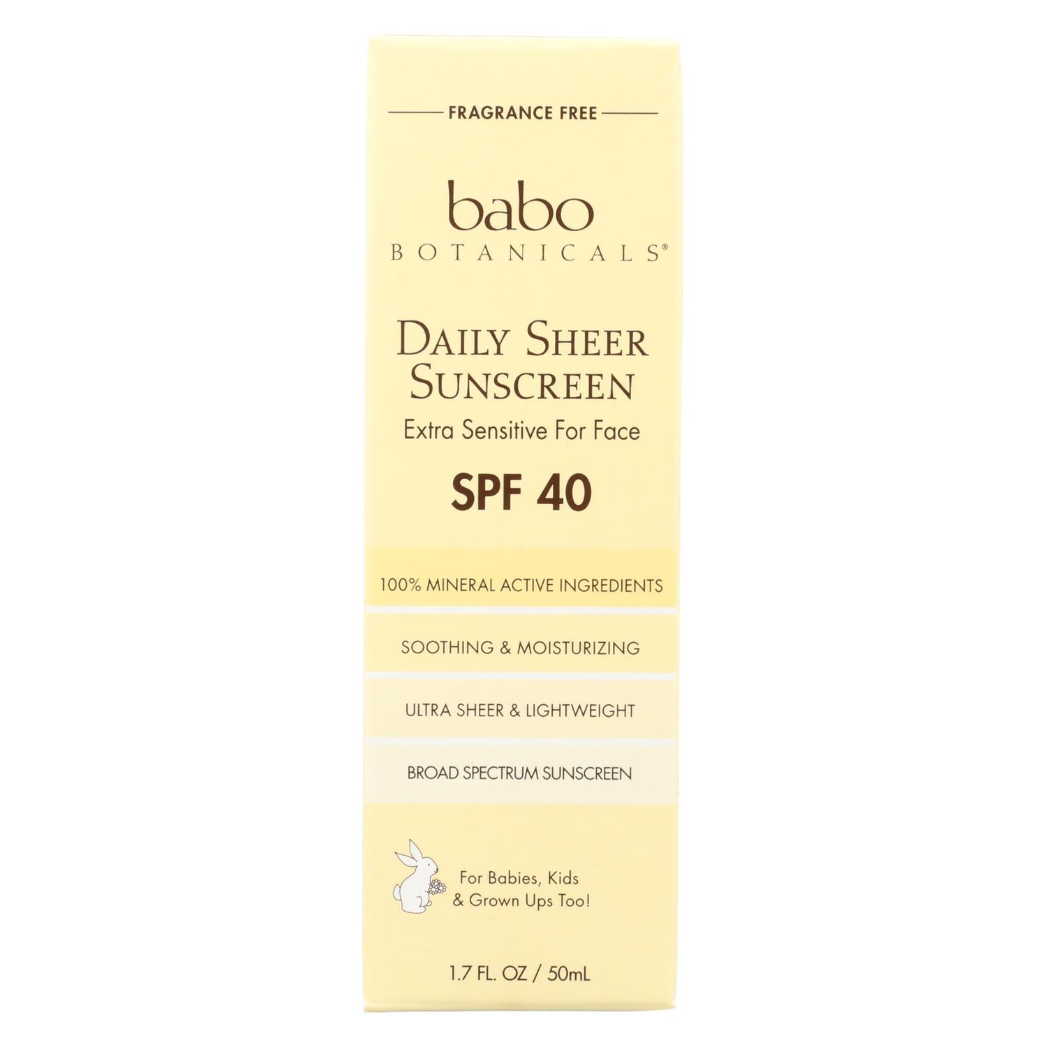 Babo botanicals fragrance free spf 40 daily sheer sunscreen lotion is made with titanium dioxide, zinc oxide, aloe vera leaf juice, sunflower seed oil, castor seed oil, beeswax, avocado oil, shea butter, jojoba seed oil and rose flower extract. Each 1.7 container is full of our extra sensitive formula for face. See label for warnings and risks.
