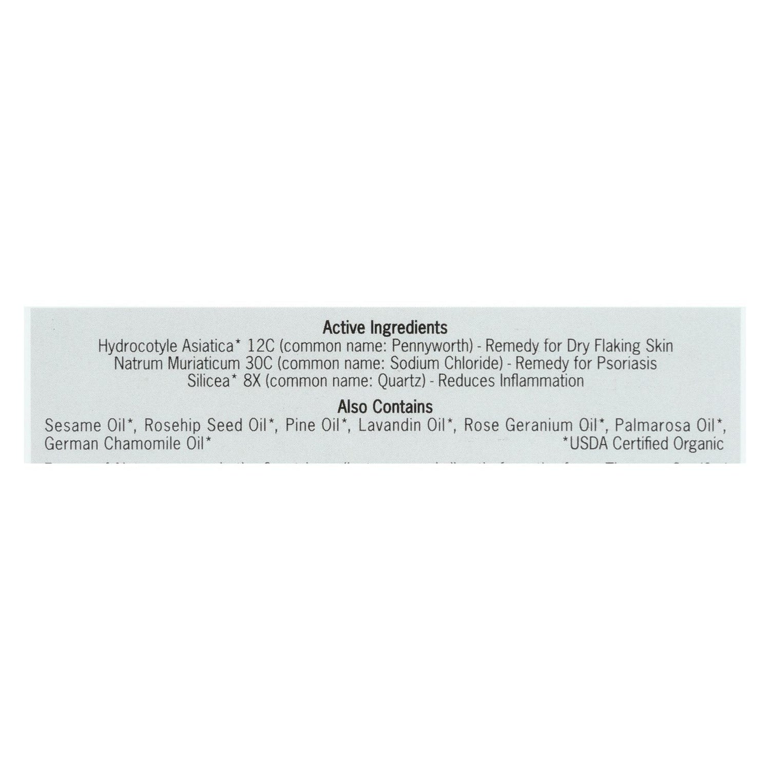 ingredients : active hydrocotyle asiatica* 12c;common name: pennyworth;- remedy for dry flaking skin natrum muriaticum 30c;common name: sodium chloride;- remedy for psoriasis silicea* 8x;common name: quartz;- reduces inflammation;also contains sesame oil;rosehip seed oil;pine oil;lavandin oil;rose geranium oil;palmarosa oil;german chamomile oil