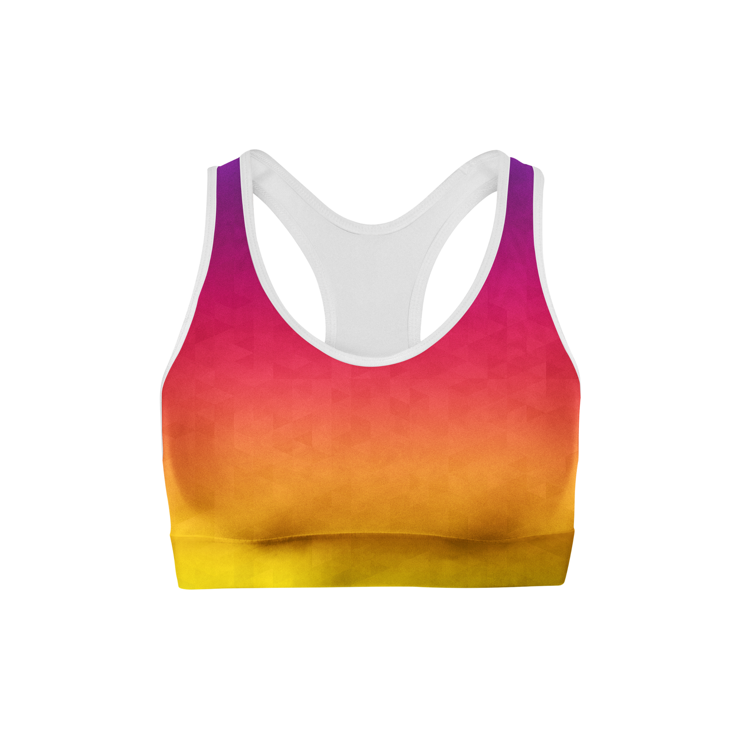 The Sunset Triangles Color Back Sports Bra helps you stay fit and focused. Lightweight Soft Lycra fabric keeps you cool, while a compression fit and four-way stretch build grant unrestricted movement. Moisture-wicking properties eliminate sweat, and the athletic racer back design with breath-ability.