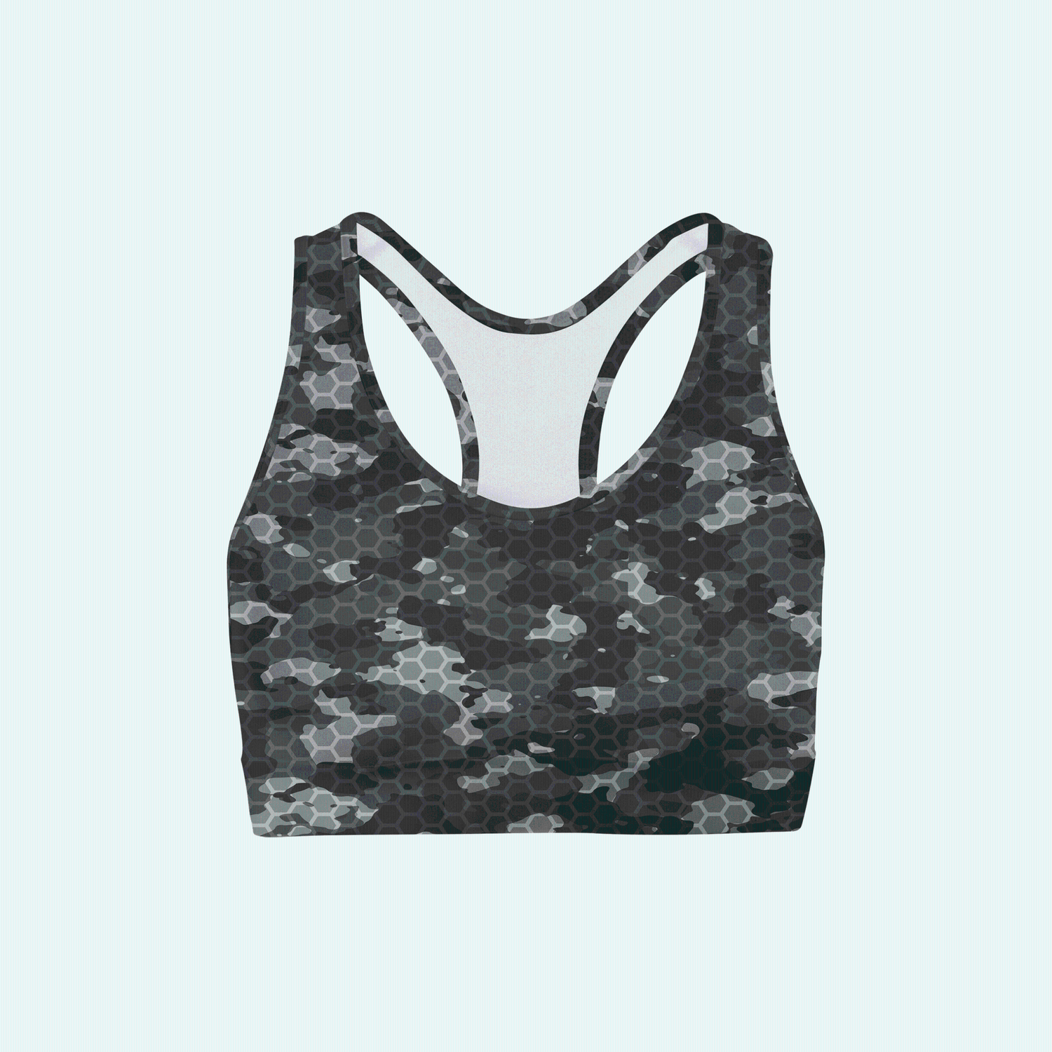 The Black Hex Camo Back Color Sports Bra helps you stay fit and focused. Lightweight Soft Lycra fabric keeps you cool, while a compression fit and four-way stretch build grant unrestricted movement. Moisture-wicking properties eliminate sweat, and the athletic racer back design with breath-ability.