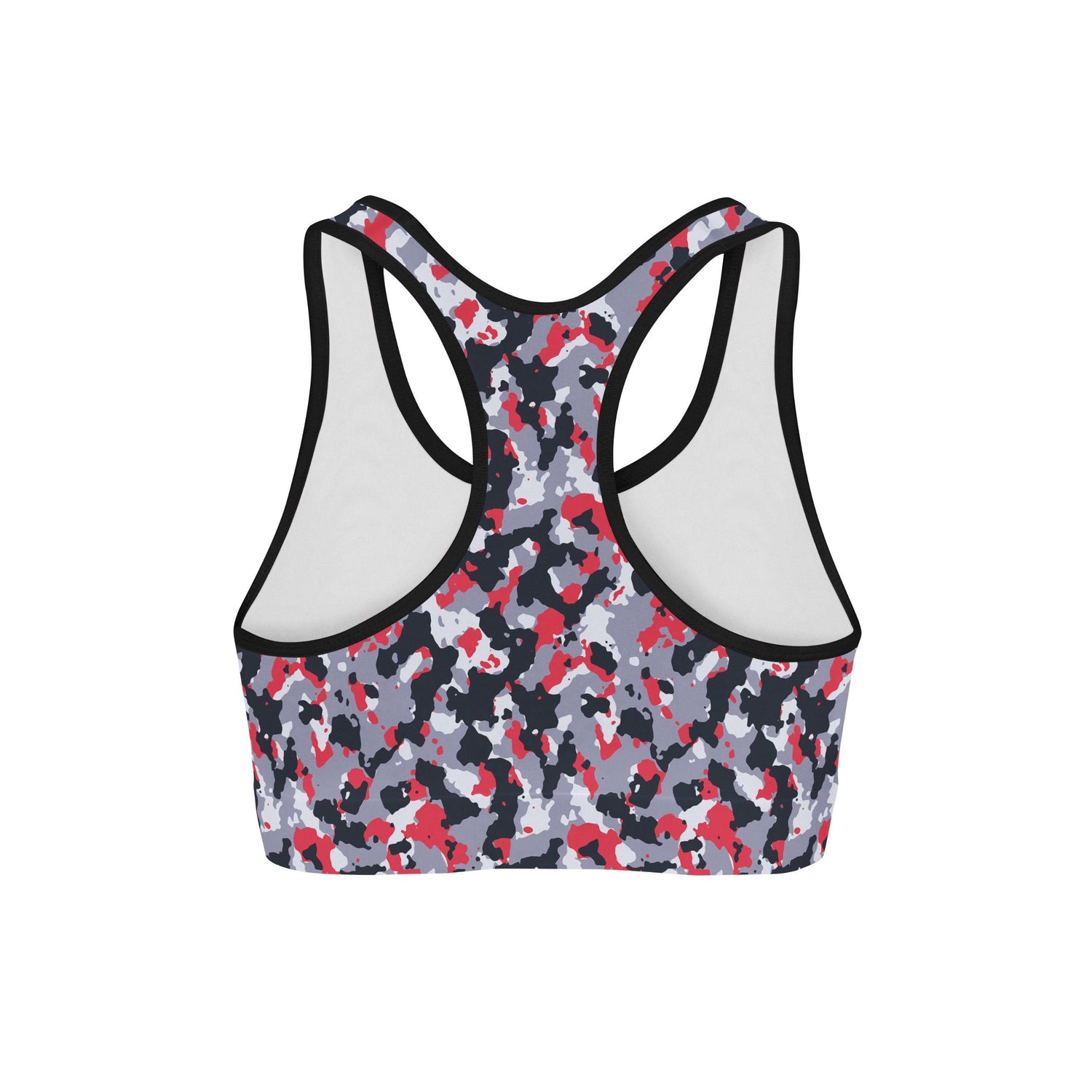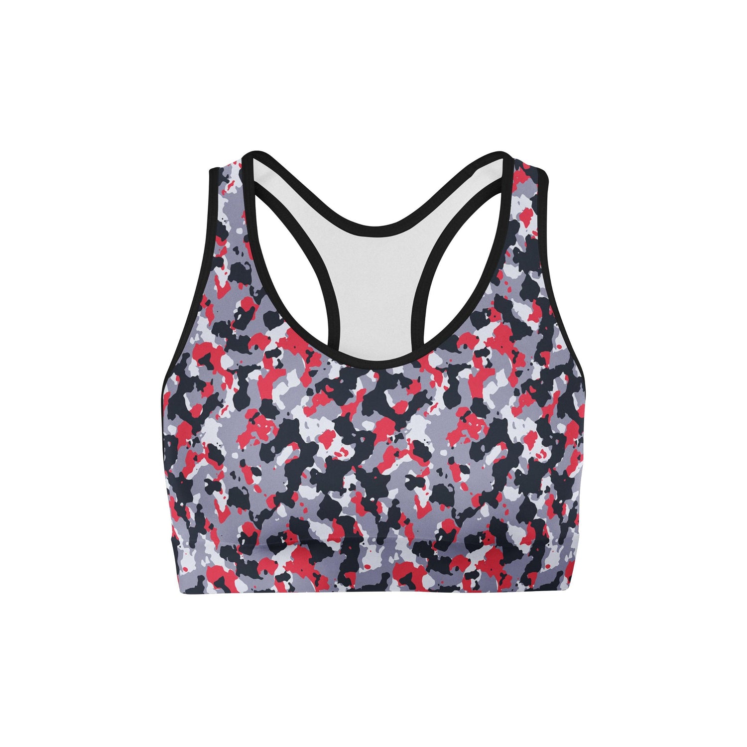 The Red White Camo Sports Bra helps you stay fit and focused. Lightweight Soft Lycra fabric keeps you cool, while a compression fit and four-way stretch build grant unrestricted movement. Moisture-wicking properties eliminate sweat, and the athletic racer back design with breath-ability.