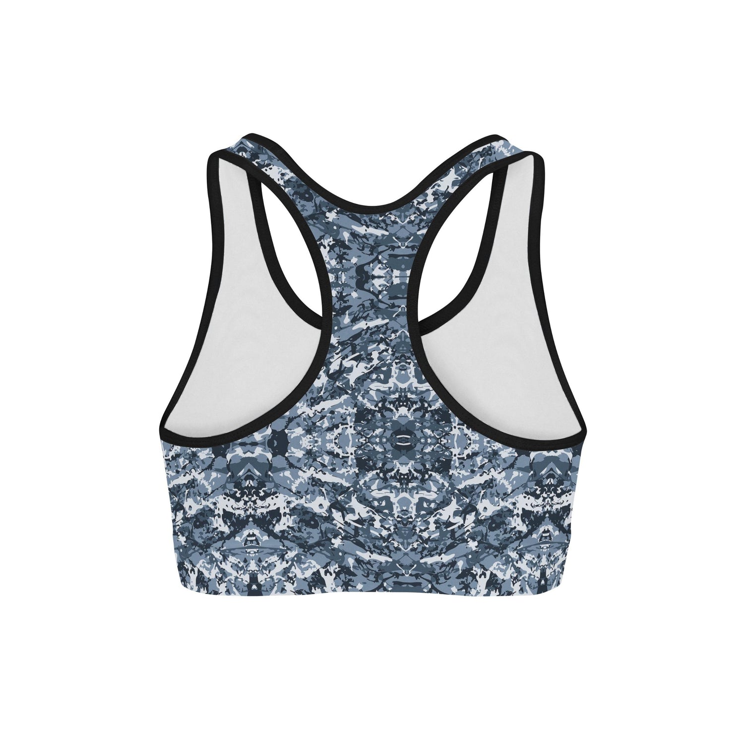 The Navy Camo Sports Bra helps you stay fit and focused. Lightweight Soft Lycra fabric keeps you cool, while a compression fit and four-way stretch build grant unrestricted movement. Moisture-wicking properties eliminate sweat, and the athletic racer back design with breath-ability.
