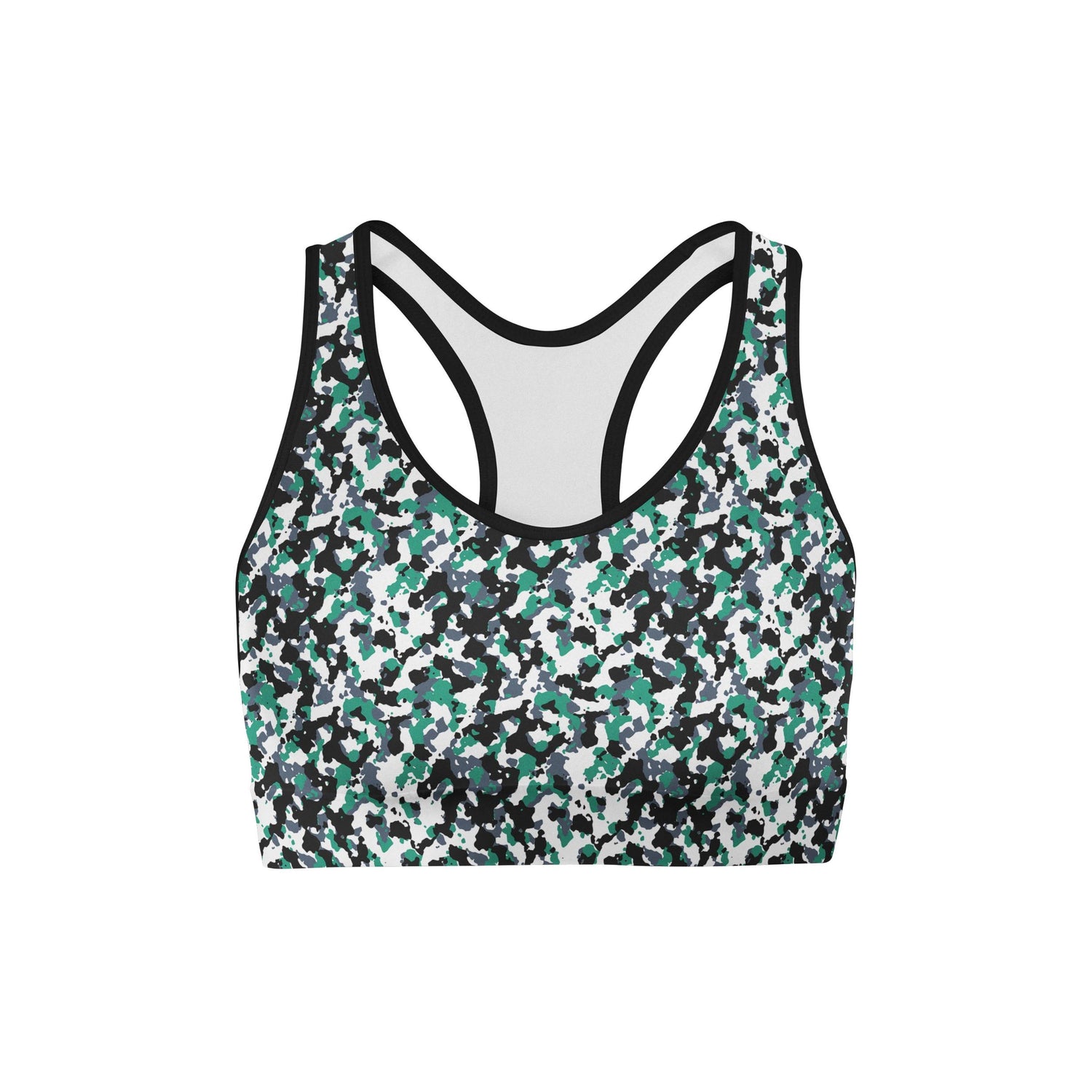 The Green White Camo Sports Bra helps you stay fit and focused. Lightweight Soft Lycra fabric keeps you cool, while a compression fit and four-way stretch build grant unrestricted movement. Moisture-wicking properties eliminate sweat, and the athletic racer back design with breath-ability.