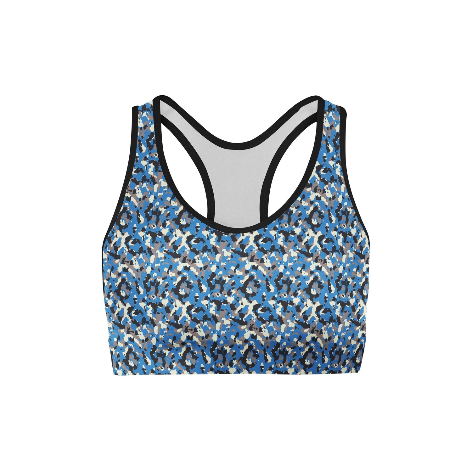 The Blue Camo Sports Bra helps you stay fit and focused. Lightweight Soft Lycra fabric keeps you cool, while a compression fit and four-way stretch build grant unrestricted movement. Moisture-wicking properties eliminate sweat, and the athletic racer back design with breath-ability.