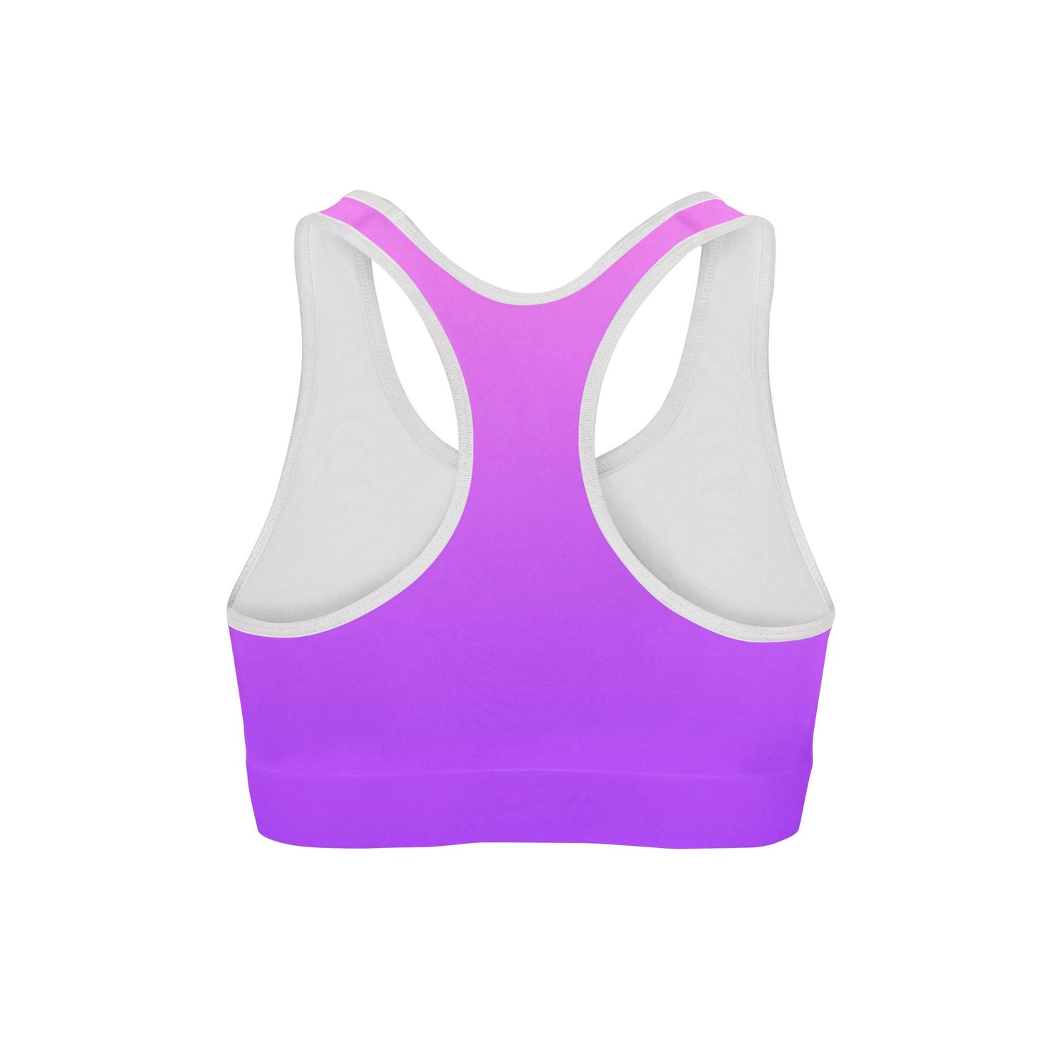 The Pink Purple Ombre Sports Bra helps you stay fit and focused. Lightweight Soft Lycra fabric keeps you cool, while a compression fit and four-way stretch build grant unrestricted movement. Moisture-wicking properties eliminate sweat, and the athletic racer back design with breath-ability.