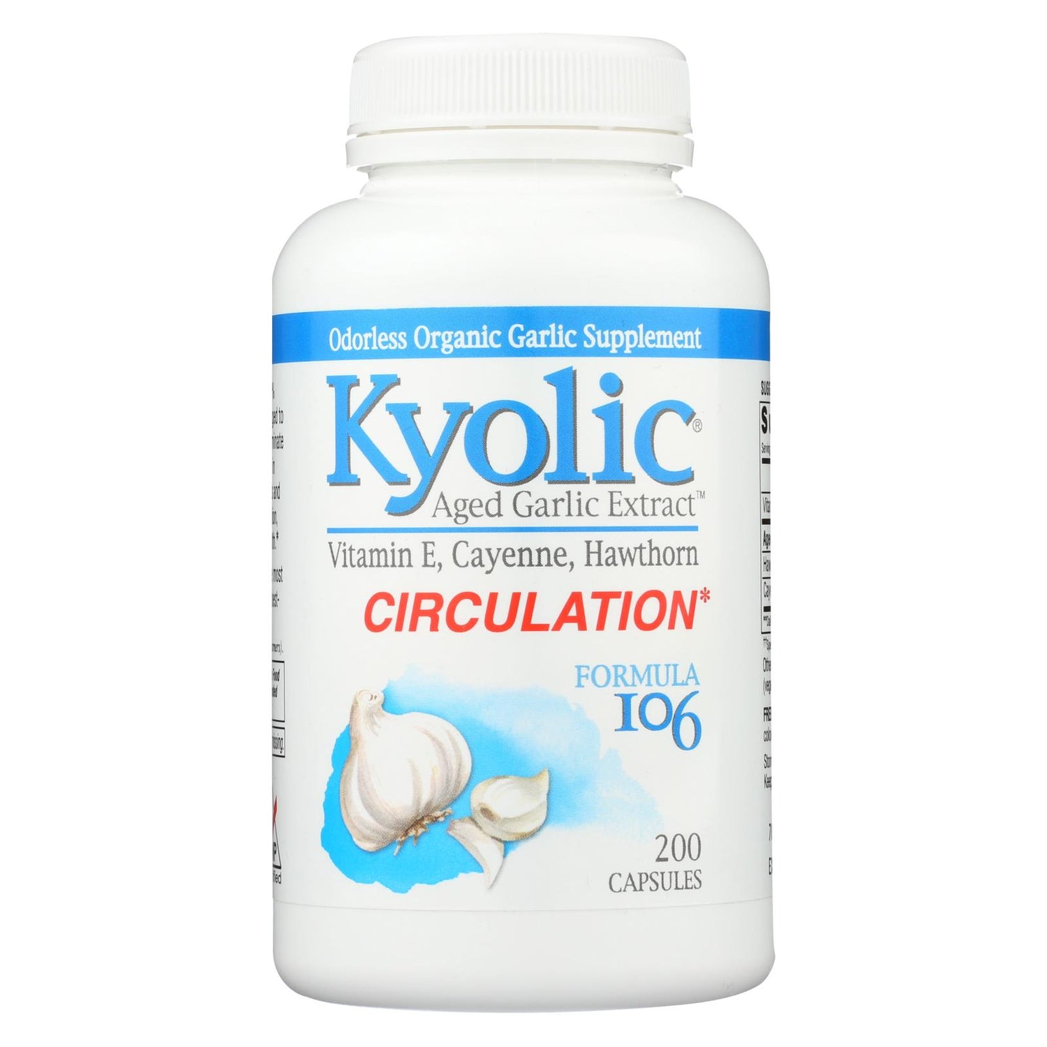 Kyolic circulation formula 106 is an odorless organic garlic supplement specially formulated with garlic extract, vitamin e, cayenne and hawthorn to maintain healthy circulation. One bottle of kyolic contains 200 capsules that are produced without any artificial colors, flavors, preservatives or sugar.