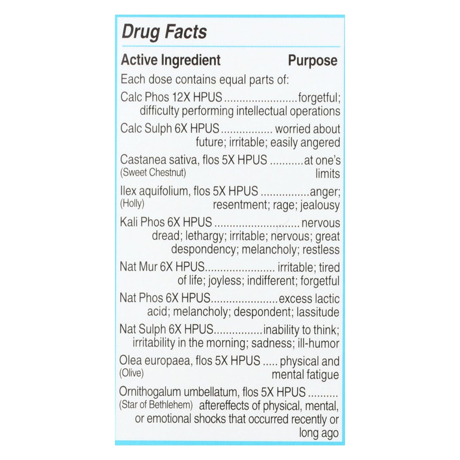 ingredients : drug facts;continued;inactive avocado;california poppy;cedar;cereus jusberti;dutchman's breeches;figwort;flame of the forest;garlic;jacob's ladder;lily of the valley;natural flavor;purified and structured water;swamp onion;wintergreen;drug facts active ingredient each does contains equal parts of: calc phos 12x hpus purpose forgetful; difficulty performing intellectual operations calc sulph 6x hpus purpose worried about future; irritable; easily angered castanea sativa;sweet chestnut;flos 5x hp
