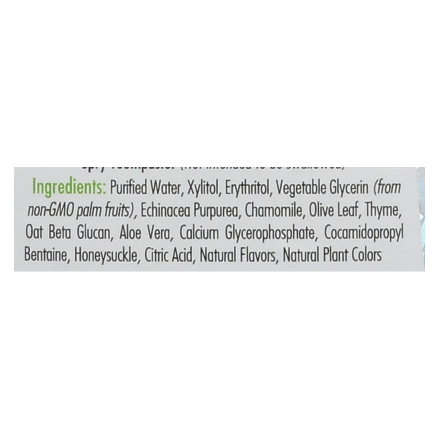 ingredients : purified water;xylitol;erythritol;vegetable glycerin;from non-gmo palm fruits;echinacea purpurea;chamomile;olive leaf;thyme;oat beta glucan;aloe vera;calcium glycerophosphate;cocamidopropyl bentaine;honeysuckle;citric acid;natural flavors;natural plant colors