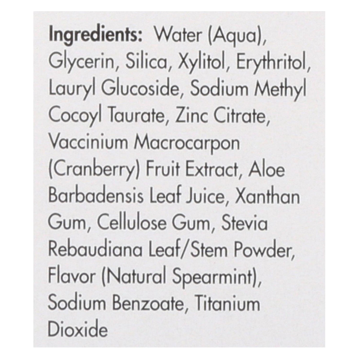 ingredients : water;aqua;glycerin;silica;xylitol;erythritol;lauryl glucoside;sodium methyl cocoyl taurate;zinc citrate;vaccinium macrocarpon;cranberry;fruit extract;aloe barbadensis leaf juice;xanthan gum;cellulose gum;stevia rebaudiana leaf/stem powder;flavor;natural spearmint;sodium benzoate;titanium dioxide