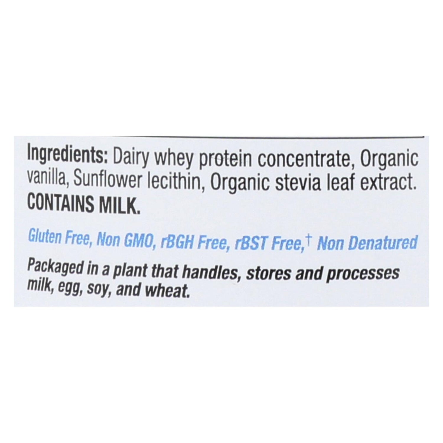 ingredients : dairy whey protein concentrate;organic only;vanilla;sunflower lecithin;organic stevia leaf extract