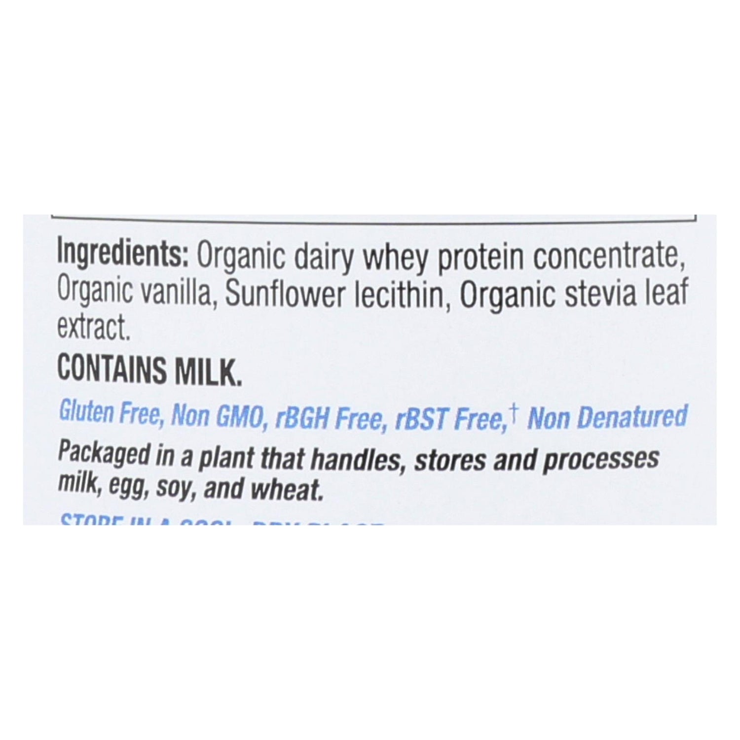 ingredients : organic dairy whey protein concentrate;organic vanilla;sunflower lecithin;organic stevia leaf extract