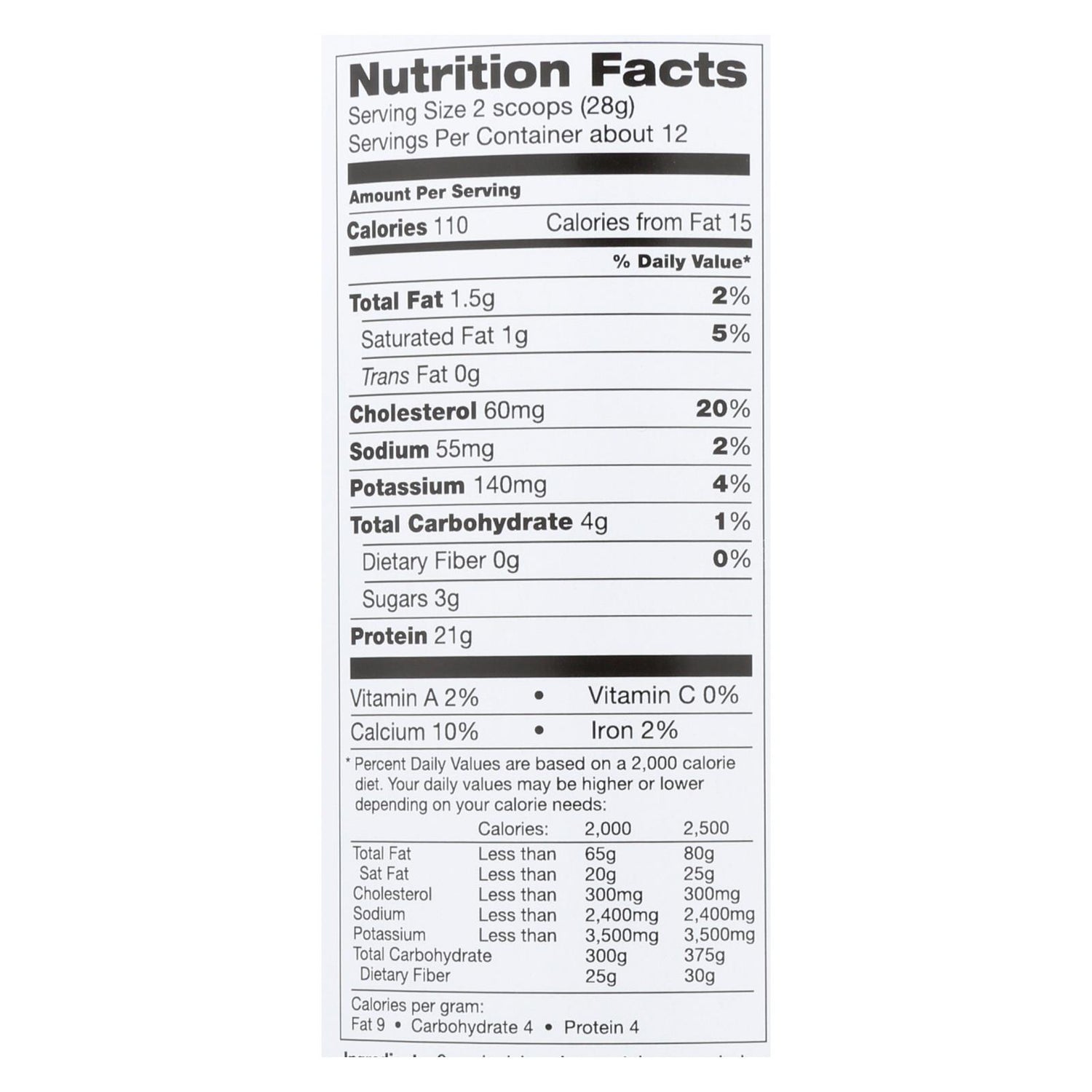 Tera'swhey organic whey protein, organic bourbon vanilla, is certified gluten-free, kosher-dairy and mosa certified organic. Every 12 oz. Canister of organic bourbon vanilla whey protein is made with grass-fed, rbgh/bst-free milk. Each 2-scoop serving provides 21 g. Of protein and 10% of the daily recommended value of calcium. See nutrition facts panel for allergens.