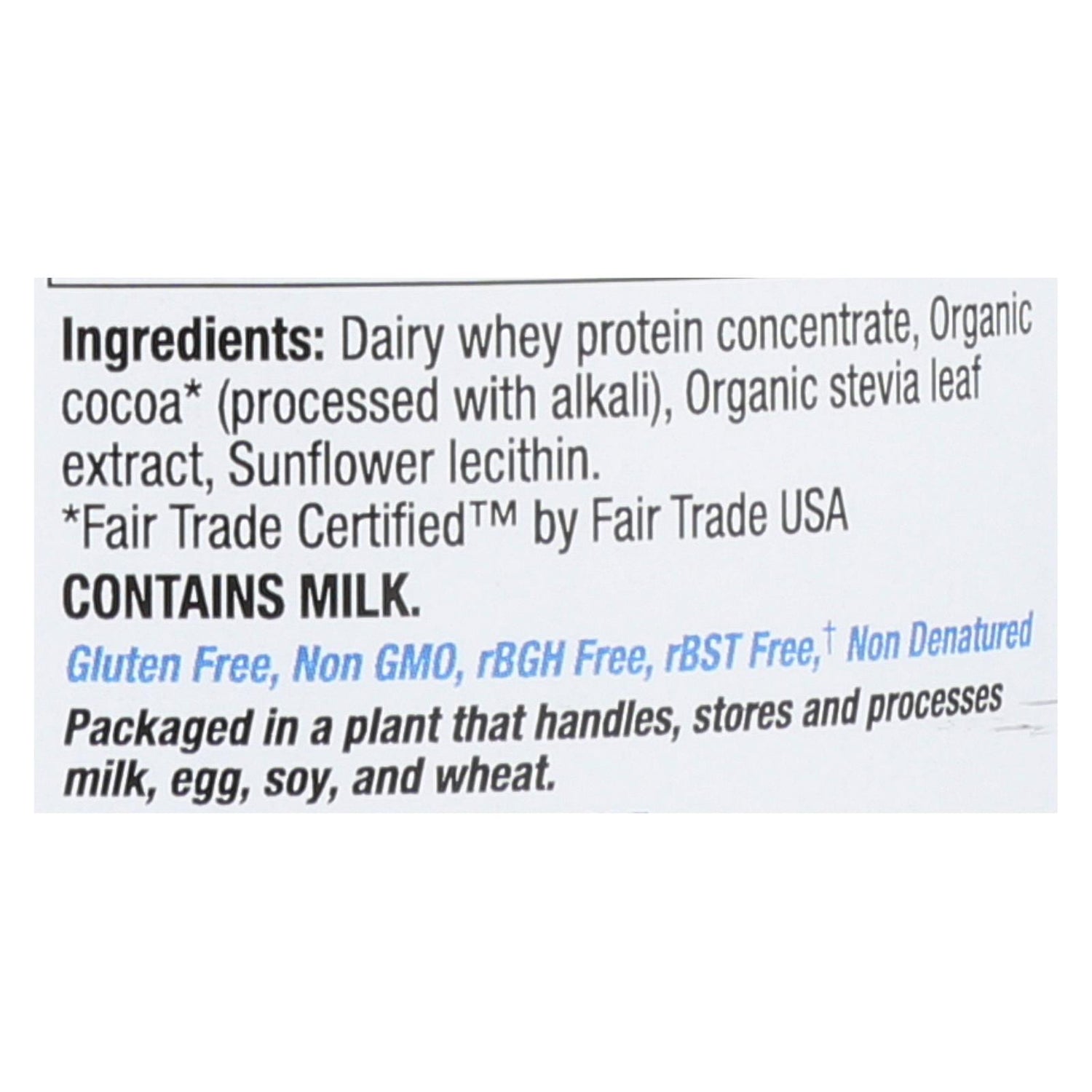 ingredients : dairy whey protein concentrate;organic cocoa;processed with alkali;organic stevia leaf extract;sunflower lecithin